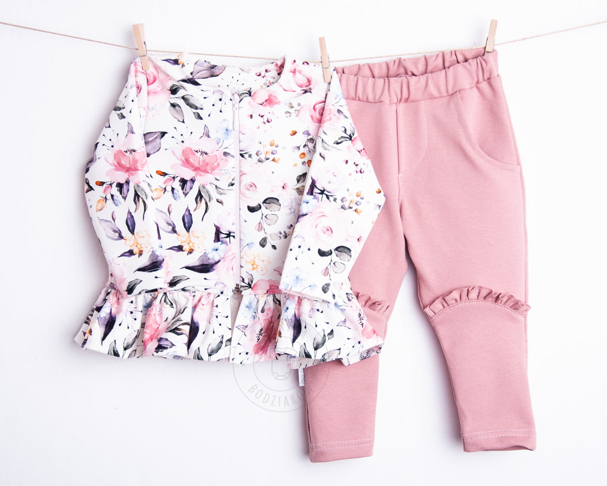 Ilus lilleline ja pilkupüüdev komplekt koosneb lukuga dressipluusist, mis on viimistletud satsilise allservaga ja roosadest pükstest, mille põlvedel on sats. Rõiva võlu peitub ilusas kangas ja hästi disainitud mudelis.